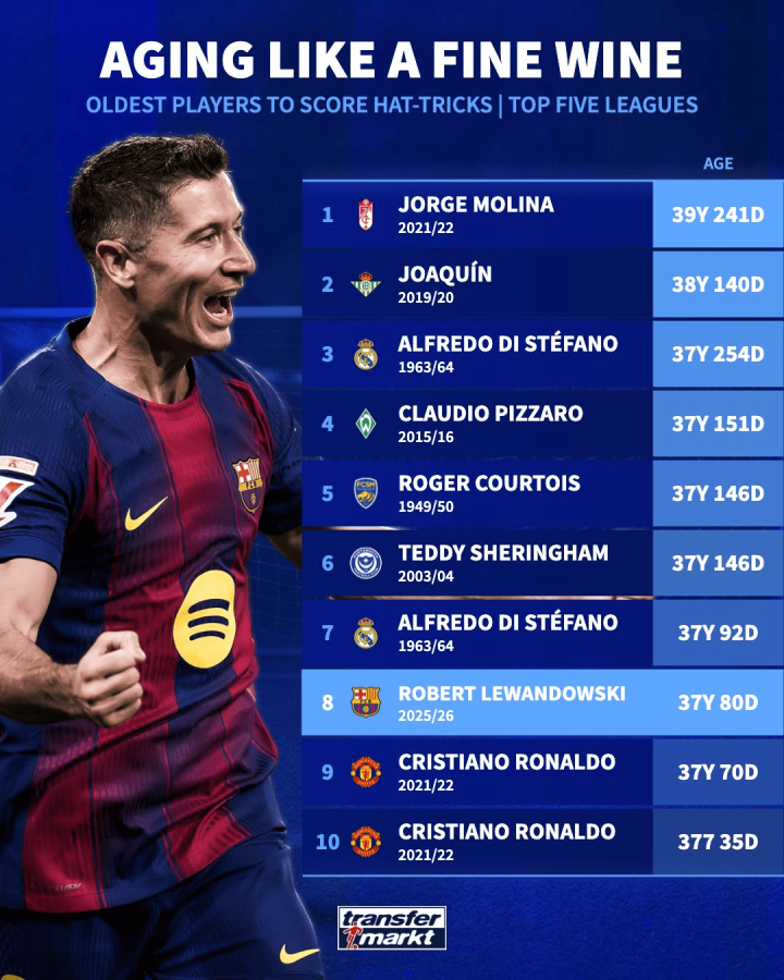 转会市场(Transfermarkt)数据统计,莱万多夫斯基在2025/26赛季以37岁80天的年龄,成为五大联赛历史上最年长的帽子戏法制造者之一。